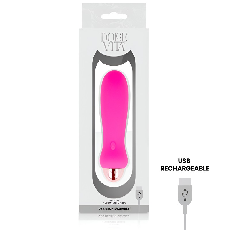 Dolce Vita Five Pink este un vibrator reîncărcabil elegant și performant de dimensiune mică 12,4 cm, conceput pentru confort, siguranță și plăcere intensă. Fabricat din silicon medical 100% hipoalergenic, cu finisaj mat, catifelat, acest vibrator se adaptează rapid la temperatura corpului și oferă o experiență plăcută la fiecare utilizare.